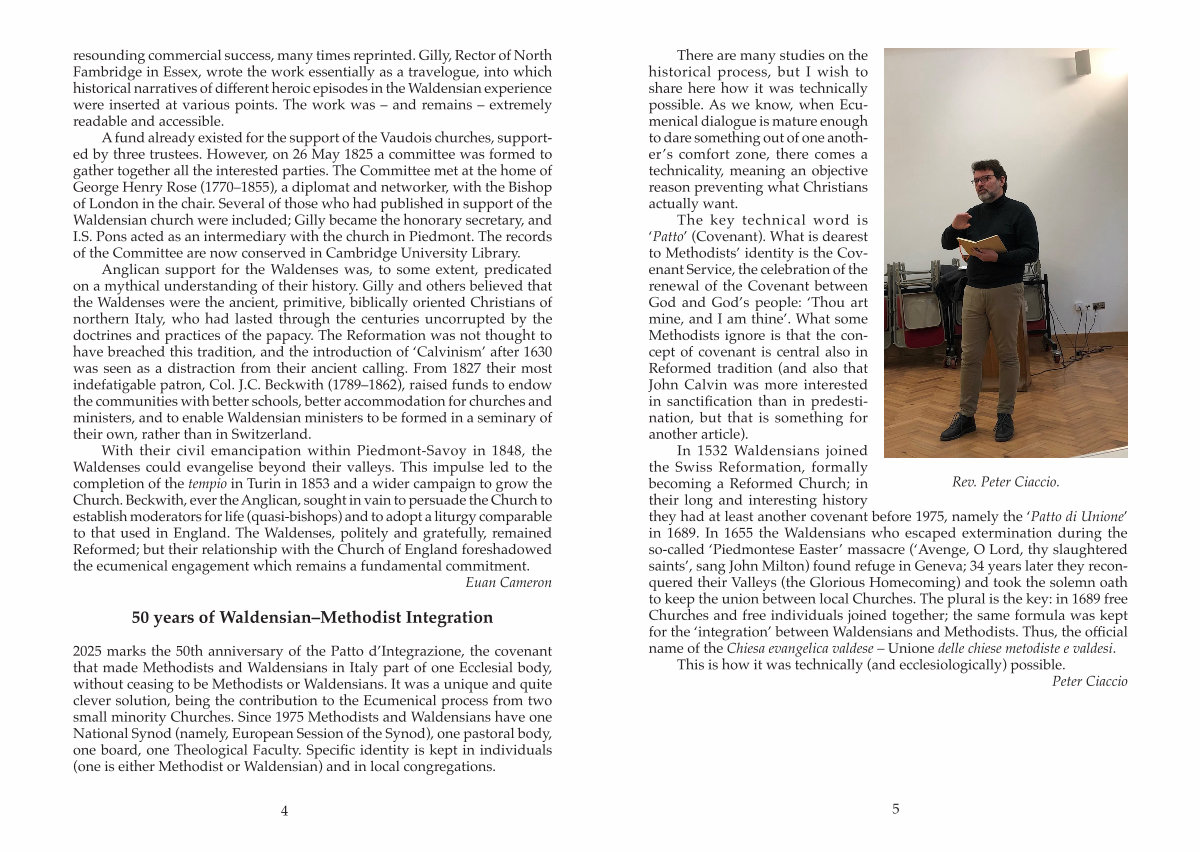 2025 marks the 50th anniversary of the Patto d’ Integrazione, the covenant that made Methodists and Waldensians in Italy part of one Ecclesial body, without ceasing to be Methodists or Waldensians. It was a unique and quite clever solution, being the contribution to the Ecumenical process from two small minority Churches. Since 1975 Methodists and Waldensians have one National Synod( namely, European Session of the Synod), one pastoral body, one board, one Theological Faculty. Specific identity is kept in individuals( one is either Methodist or Waldensian) and in local congregations.