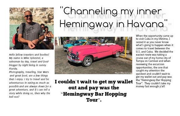 When the opportunity came up to visit Cuba in my lifetime, I seized it as you never know what’s going to happen when it comes to travel between the U.S. and Cuba. We decided the easiest route was taking a cruise out of my home city of Tampa on Carnival and when reviewing the excursion opportunities, the one that caught my attention the quickest and couldn’t wait to get my wallet out and pay was the “Hemingway Bar Hopping Tour”. They couldn’t take my money fast enough y’all!