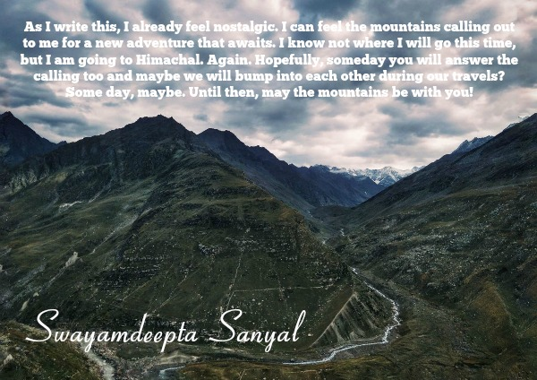As I write this, I already feel nostalgic. I can feel the mountains calling out to me for a new adventure that awaits. I know not where I will go this time, but I am going to Himachal. Again. Hopefully, someday you will answer the calling too and maybe we will bump into each other during our travels? Some day, maybe. Until then, may the mountains be with you!