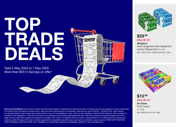 Terms and Conditions: Only valid in Costco warehouses located in Australia and while stock lasts. All items may not be available in every warehouse. Purchase limits may apply to certain items. See your local warehouse for more details. Savings are valid 05 / 05 / 25- 07 / 05 / 25 only. Items shown are representations and colours and variants shown may not be available on sale. Liquor is not available in QLD and SA locations. WA is subject to updated liquor legislation. * Total amount saved on purchase of one of each advertised sale item. Services, products and pricing featured on this page are accurate when posted and subject to change in the future. It is against the law to sell or supply alcohol to, or obtain alcohol on behalf of, a person under the age of 18 years. Costco supports the responsible service and consumption of alcohol. Liquor Licence: NSW-LIQP770010247, LIQP770016625, LIQP770017058. ACT-14005609. VIC-32061303, 32064440, 32065682, 32067781. WA-603213623419.