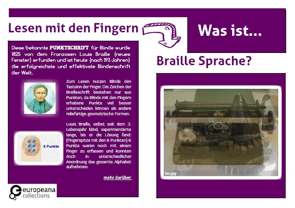 Diese bekannte Punktschrift für Blinde wurde 1825 von dem Franzosen Louis Braille (neues Fenster) erfunden und ist heute (nach 193 Jahren) die erfolgreichste und effektivste Blindenschrift der Welt.