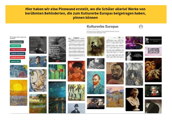Hier haben wir eine Pinnwand erstellt, wo die Schüler allerlei Werke von berühmten Behinderten, die zum Kulturerbe Europas beigetragen haben, pinnen können