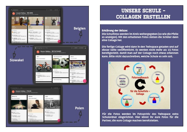 Die fertige Collage wird dann in den Twinspace geladen und auf dieser Seite veröffentlicht. Es werden nicht mehr als 15 Fotos bereitgestellt. damit man auf der Collage noch etwas erkennen kann. Bitte nicht dazuschreiben, welche Schule es sein soll.