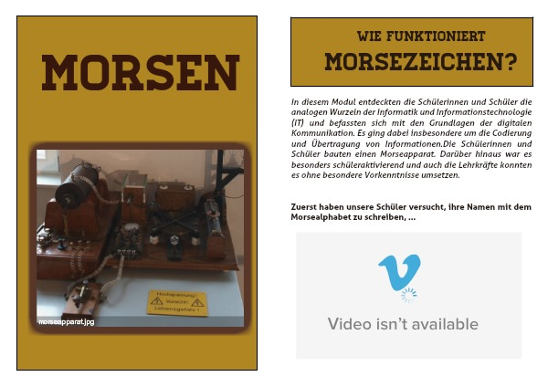 In diesem Modul entdeckten die Schülerinnen und Schüler die analogen Wurzeln der Informatik und Informationstechnologie (IT) und befassten sich mit den Grundlagen der digitalen Kommunikation. Es ging dabei insbesondere um die Codierung und Übertragung von Informationen.Die Schülerinnen und Schüler bauten einen Morseapparat. Darüber hinaus war es besonders schüleraktivierend und auch die Lehrkräfte konnten es ohne besondere Vorkenntnisse umsetzen.