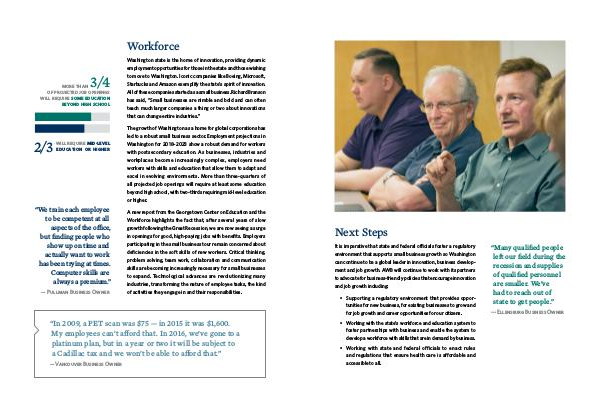 It is imperative that state and federal officials foster a regulatory environment that supports small business growth so Washington can continue to be a global leader in innovation, business development and job growth. AWB will continue to work with its partners to advocate for business-friendly policies that encourage innovation and job growth including:
