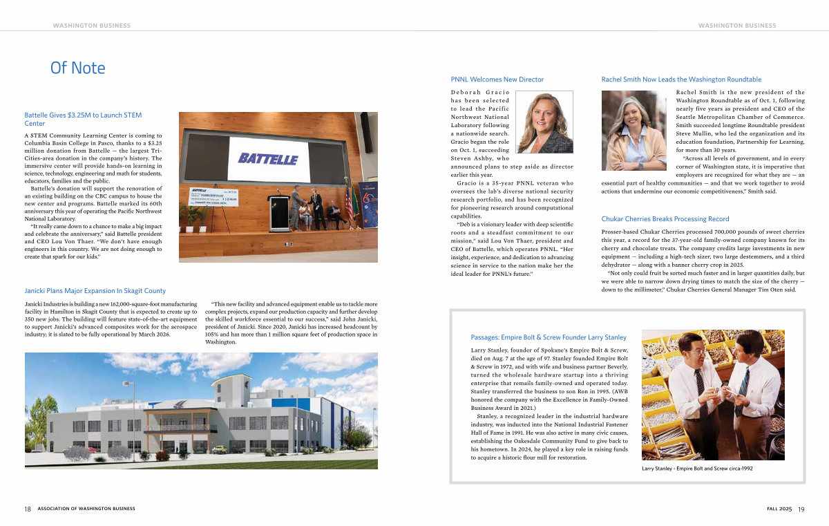 Larry Stanley, founder of Spokane’ s Empire Bolt & Screw, died on Aug. 7 at the age of 97. Stanley founded Empire Bolt & Screw in 1972, and with wife and business partner Beverly, turned the wholesale hardware startup into a thriving enterprise that remails family-owned and operated today. Stanley transferred the business to son Ron in 1995.( AWB honored the company with the Excellence in Family-Owned Business Award in 2021.)