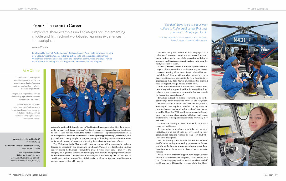 Consider Summit Pacific, a public hospital district in Grays Harbor County that is leading the way on careerconnected learning. Their innovative work-based learning model doesn’ t just benefit aspiring nurses; it creates opportunities across various fields, from hospitality to engineering. CEO Josh Martin emphasizes the pressing need for apprenticeships beyond clinical roles.