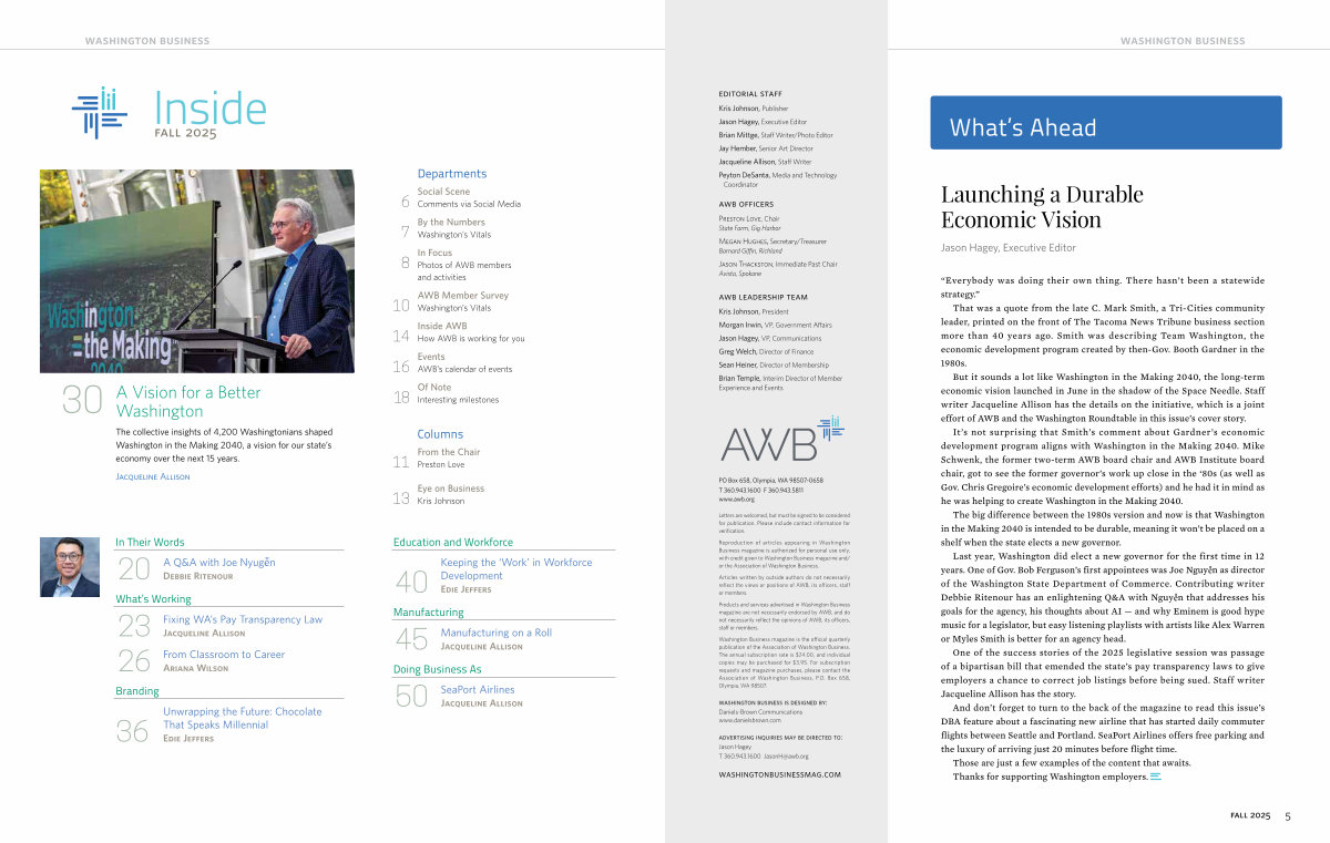 The collective insights of 4,200 Washingtonians shaped Washington in the Making 2040, a vision for our state’ s economy over the next 15 years.