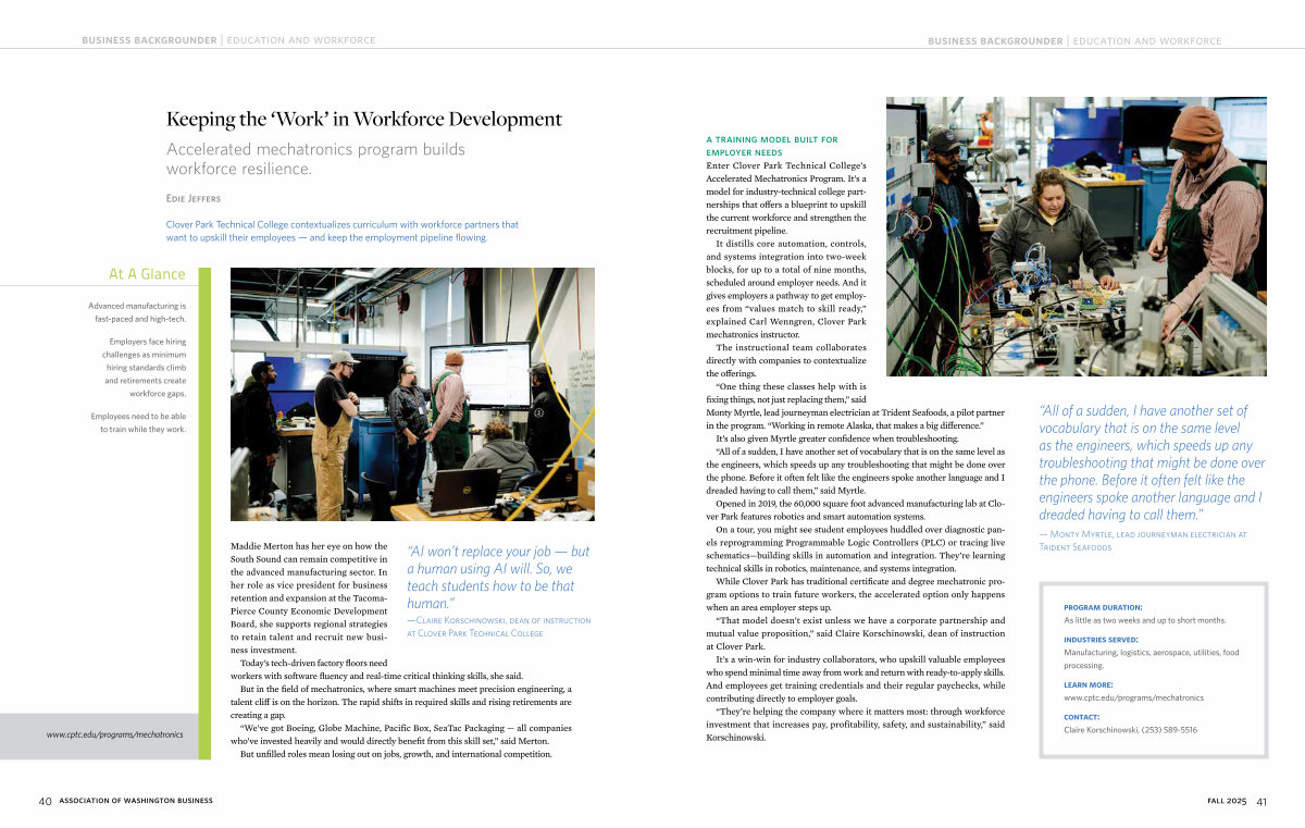 Enter Clover Park Technical College’ s Accelerated Mechatronics Program. It’ s a model for industry-technical college partnerships that offers a blueprint to upskill the current workforce and strengthen the recruitment pipeline.