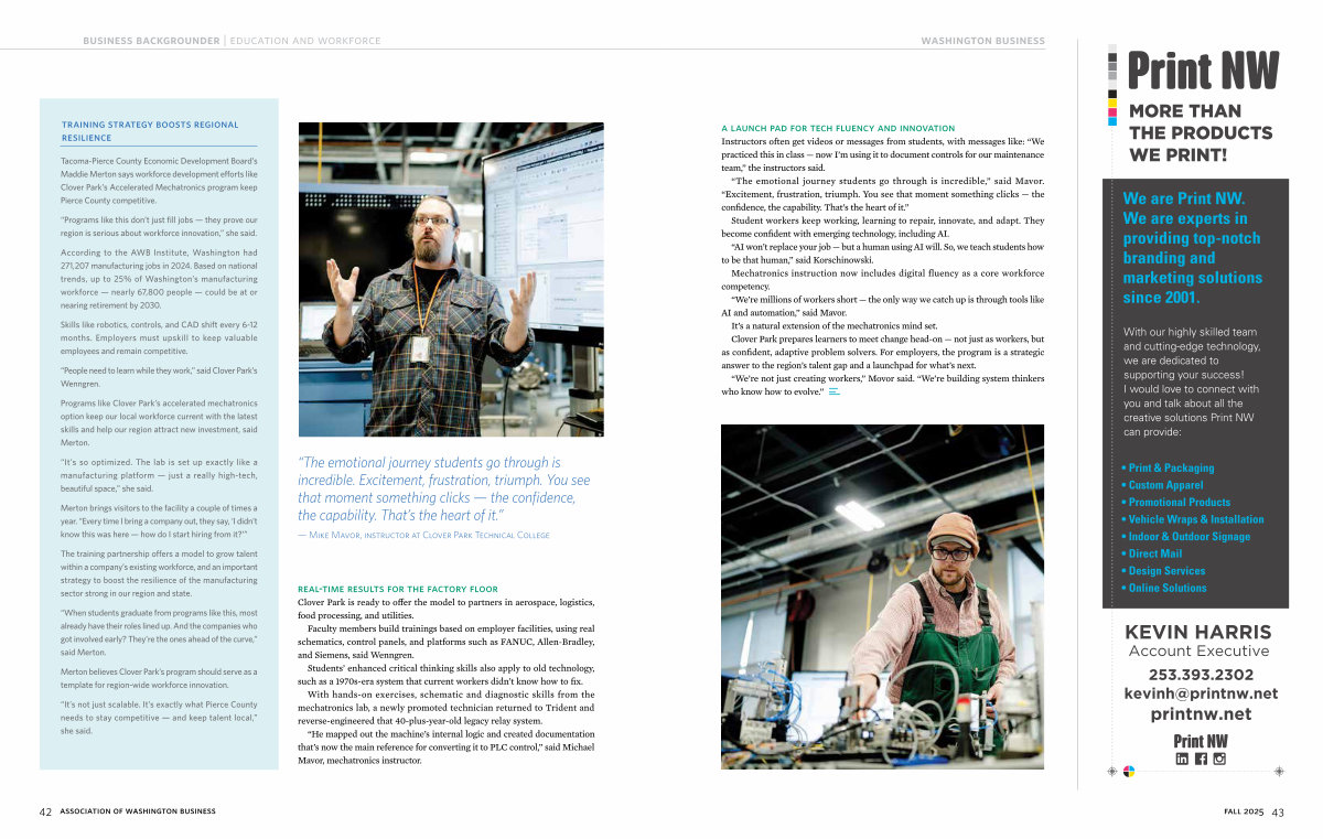 AI and automation,” said Mavor. It’ s a natural extension of the mechatronics mind set. Clover Park prepares learners to meet change head-on— not just as workers, but as confident, adaptive problem solvers. For employers, the program is a strategic answer to the region’ s talent gap and a launchpad for what’ s next.