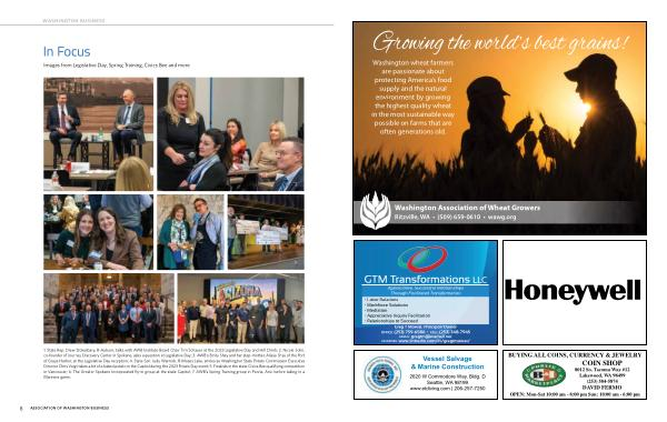 1 . State Rep . Drew Stokesbary , R-Auburn , talks with AWB Institute Board Chair Tim Schauer at the 2023 Legislative Day and Hill Climb ; 2 . Nicole Sohn , co-founder of Journey Discovery Center in Spokane , asks a question at Legislative Day ; 3 . AWB ’ s Emily Shay and her step-mother , Alissa Shay of the Port of Grays Harbor , at the Legislative Day reception ; 4 . State Sen . Judy Warnick , R-Moses Lake , smiles as Washington State Potato Commission Executive Director Chris Voigt takes a bit of a baked potato in the Capitol during the 2023 Potato Day event ; 5 . Finalists in the state Civics Bee qualifying competition in Vancouver ; 6 . The Greater Spokane Incorporated fly-in group at the state Capitol ; 7 . AWB ’ s Spring Training group in Peoria , Ariz . before taking in a Mariners game .