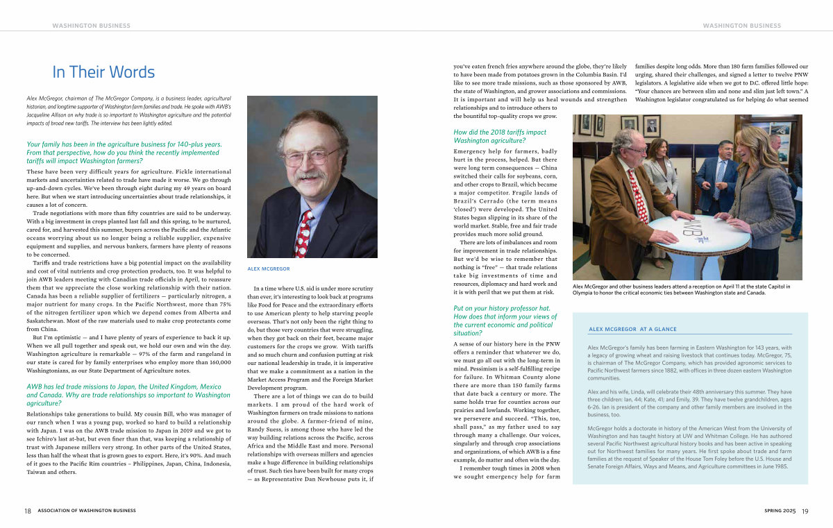 Alex McGregor’ s family has been farming in Eastern Washington for 143 years, with a legacy of growing wheat and raising livestock that continues today. McGregor, 75, is chairman of The McGregor Company, which has provided agronomic services to Pacific Northwest farmers since 1882, with offices in three dozen eastern Washington communities.