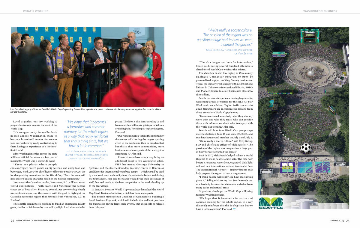 — Leo Flor, chief legacy officer of Seattle FWC26, the local organizing committee for the World Cup prizes. The idea is that fans traveling to and from matches will make pitstops in Yakima or Bellingham, for example, to play the game, Flor said.