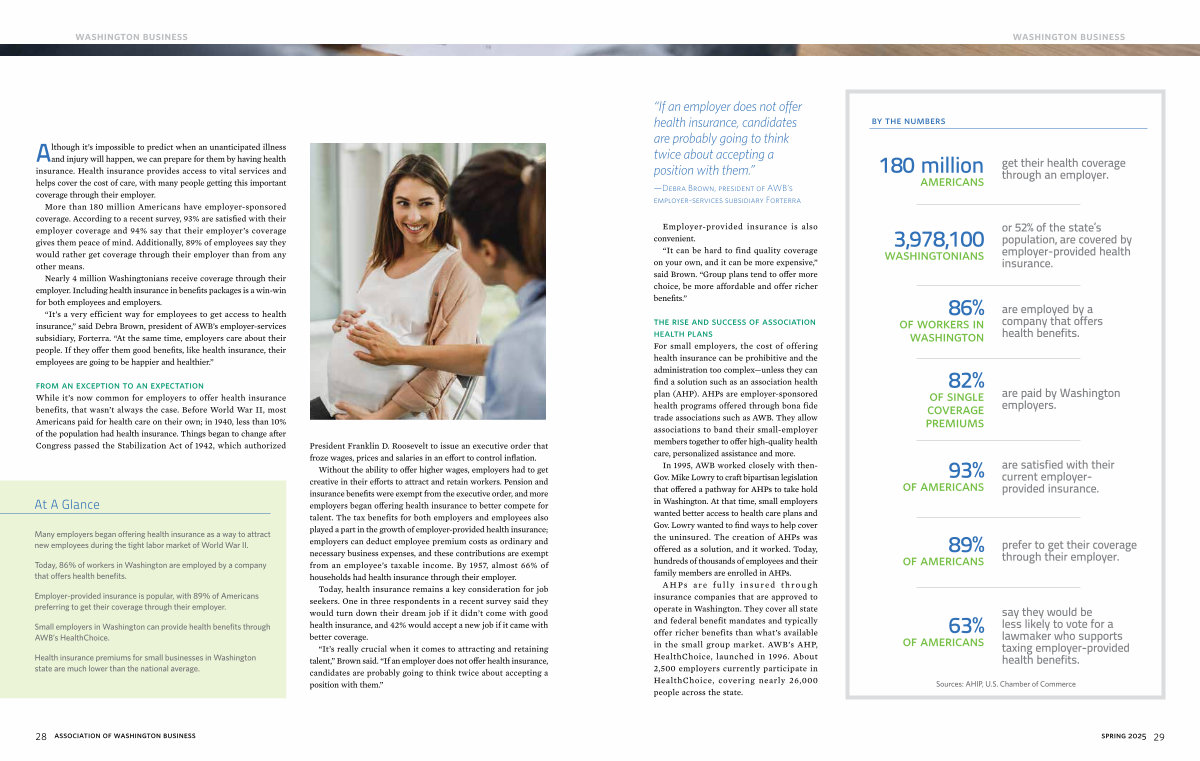 “ It’ s a very efficient way for employees to get access to health insurance,” said Debra Brown, president of AWB’ s employer-services subsidiary, Forterra.“ At the same time, employers care about their people. If they offer them good benefits, like health insurance, their employees are going to be happier and healthier.”