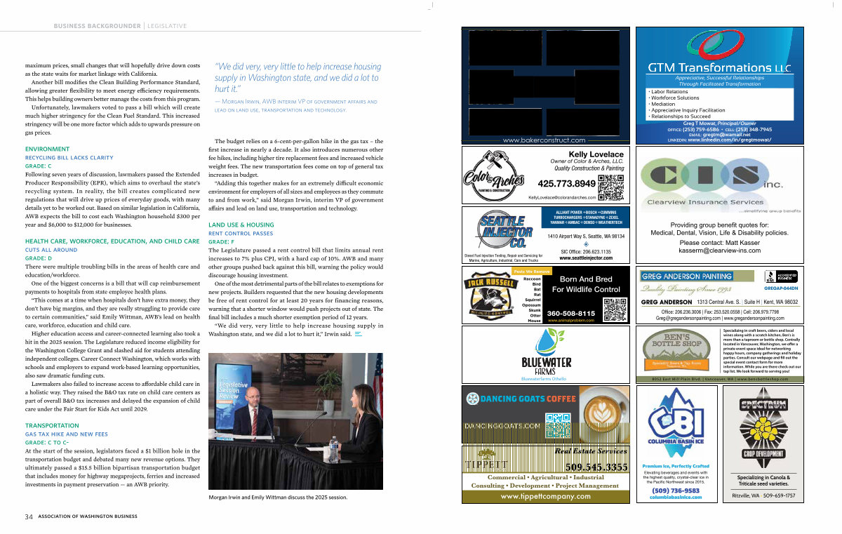 “ We did very, very little to help increase housing supply in Washington state, and we did a lot to hurt it,” Irwin said. transportation gas tax hike and new fees grade: c to c-