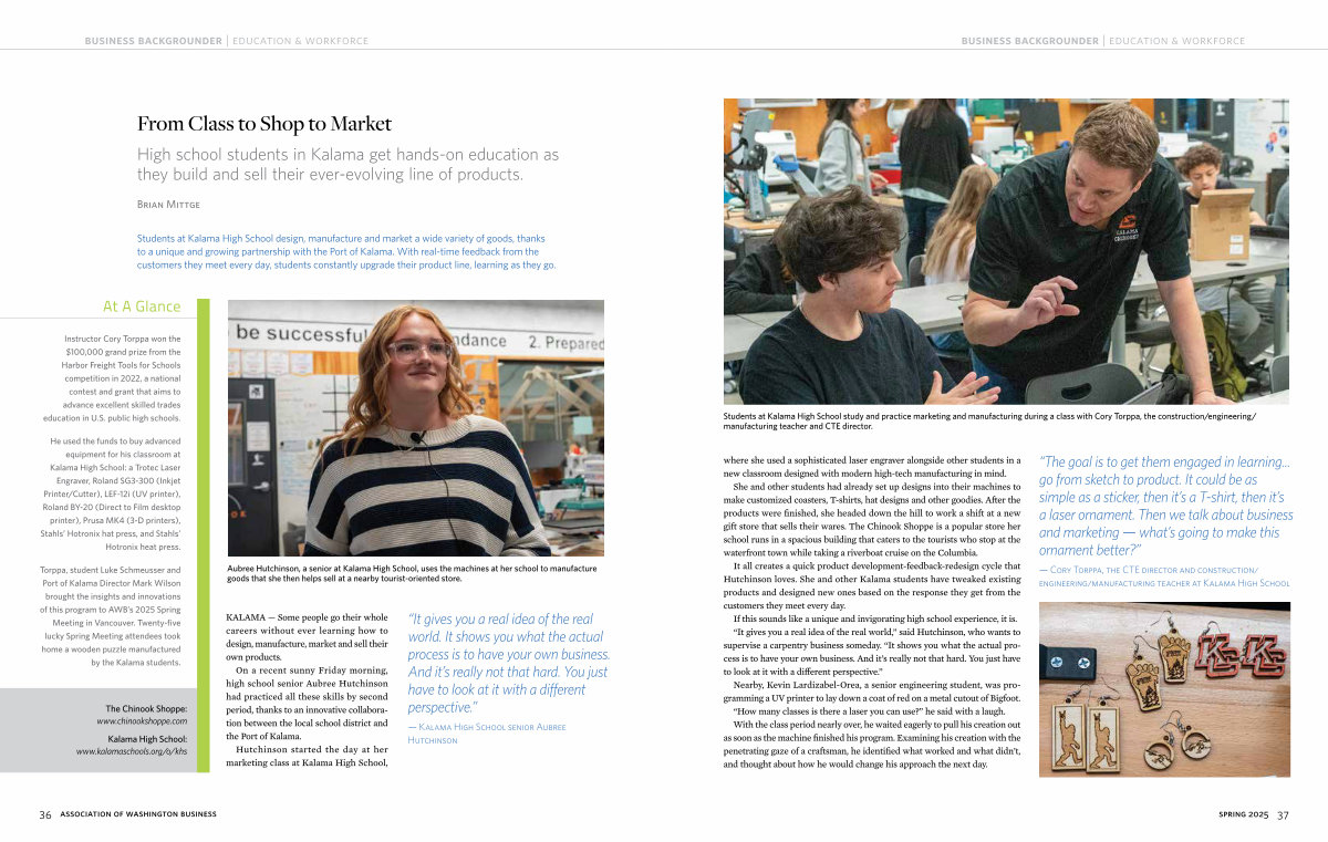 Students at Kalama High School study and practice marketing and manufacturing during a class with Cory Torppa, the construction / engineering / manufacturing teacher and CTE director.