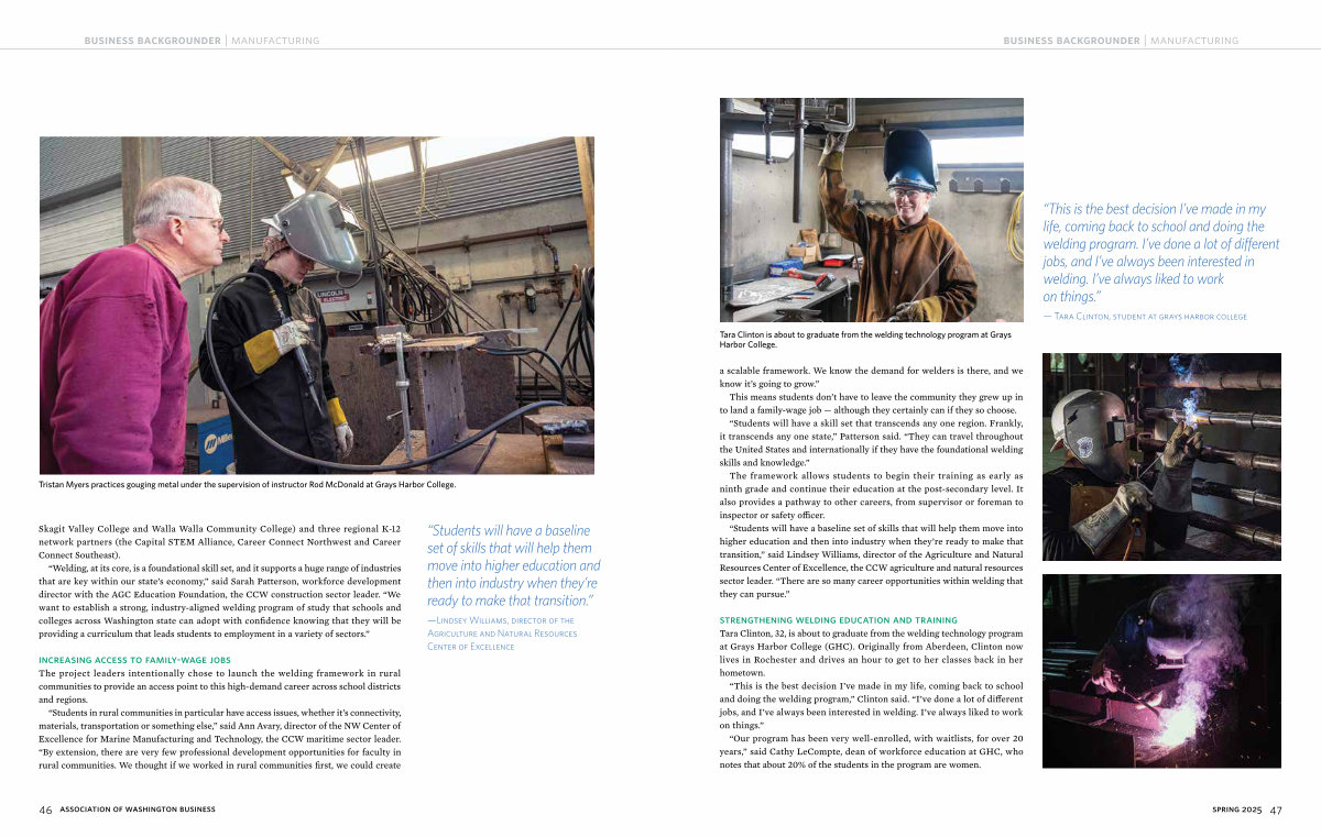 “ Welding, at its core, is a foundational skill set, and it supports a huge range of industries that are key within our state’ s economy,” said Sarah Patterson, workforce development director with the AGC Education Foundation, the CCW construction sector leader.“ We want to establish a strong, industry-aligned welding program of study that schools and colleges across Washington state can adopt with confidence knowing that they will be providing a curriculum that leads students to employment in a variety of sectors.”