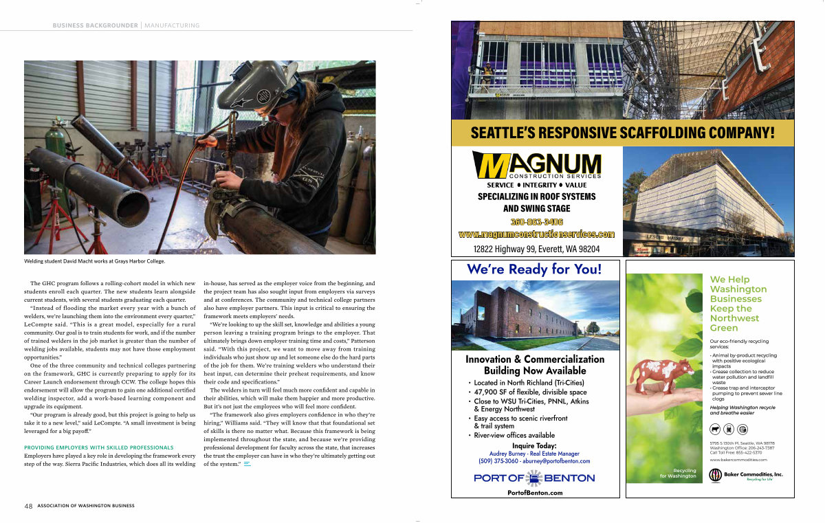 One of the three community and technical colleges partnering on the framework, GHC is currently preparing to apply for its Career Launch endorsement through CCW. The college hopes this endorsement will allow the program to gain one additional certified welding inspector, add a work-based learning component and upgrade its equipment.