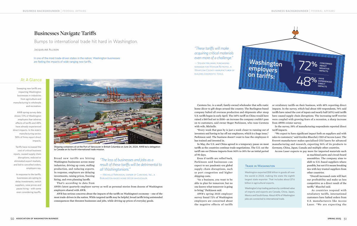 AWB’ s spring 2025 employer survey found 72 % of Washington employers are concerned about the negative effects of tariffs
