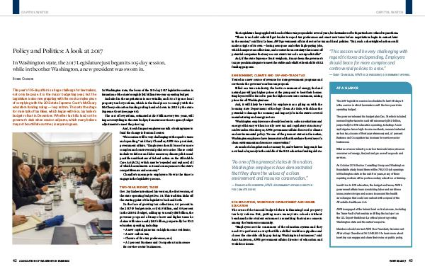 In addition to K-12 education, the budget and taxes, AWB’ s government affairs team is watching labor and workforce issues, water storage and access issues and the health care changes that could come about with a repeal of the Affordable Healthcare Act.