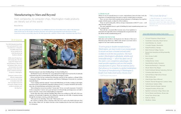 AWB ’ s sixth-annual Manufacturing Week bus tour highlighted all sorts of innovative items made in the Evergreen State and focused on the equally innovative education and workforce development work being done to help tomorrow ’ s workers successfully step into the high-paying jobs available in these modern manufacturing shop floors .