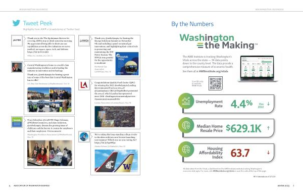 All data taken from the Vitals , a dashboard on the AWB Institute website tracking Washington ’ s economic vital signs . For more , visit AWBinstitute . org / vitals or scan the code at the top of the page .