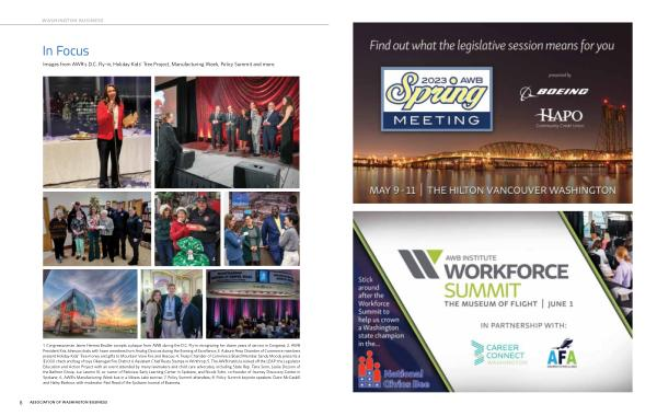 1 . Congresswoman Jaime Herrera Beutler accepts a plaque from AWB during the D . C . Fly-in recognizing her dozen years of service in Congress ; 2 . AWB President Kris Johnson chats with team members from Analog Devices during the Evening of Excellence ; 3 . Auburn Area Chamber of Commerce members present Holiday Kids ’ Tree money and gifts to Mountain View Fire and Rescue ; 4 . Twisp Chamber of Commerce Board Member Sandy Moody presents a $ 1,000 check and bag of toys Okanogan Fire District 6 Assistant Chief Rusty Stamps in Winthrop ; 5 . The AWB Institute kicked off the LEAP : the Legislator Education and Action Project with an event attended by many lawmakers and child care advocates , including State Rep . Tana Senn , Leslie Dozono of the Ballmer Group , Luc Jasmin III , co-owner of Parkview Early Learning Center in Spokane , and Nicole Sohn , co-founder of Journey Discovery Center in Spokane ; 6 . AWB ’ s Manufacturing Week bus in a Moses Lake sunrise ; 7 . Policy Summit attendees ; 8 . Policy Summit keynote speakers Claire McCaskill and Haley Barbour , with moderator Paul Read of the Spokane Journal of Business .
