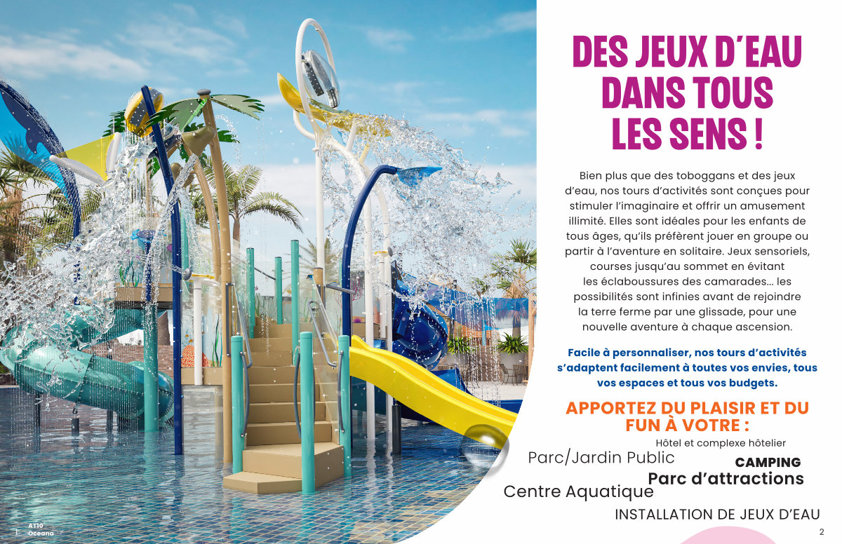 Bien plus que des toboggans et des jeux d’ eau, nos tours d’ activités sont conçues pour stimuler l’ imaginaire et offrir un amusement illimité. Elles sont idéales pour les enfants de tous âges, qu’ ils préfèrent jouer en groupe ou partir à l’ aventure en solitaire. Jeux sensoriels, courses jusqu’ au sommet en évitant les éclaboussures des camarades... les possibilités sont infinies avant de rejoindre la terre ferme par une glissade, pour une nouvelle aventure à chaque ascension.