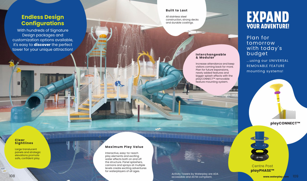 Interactive, easy-to-reach play elements and exciting water effects both on and off the structure. Panel splashers, cannons and sprays at multiple levels create exciting adventures for waterplayers of all ages.