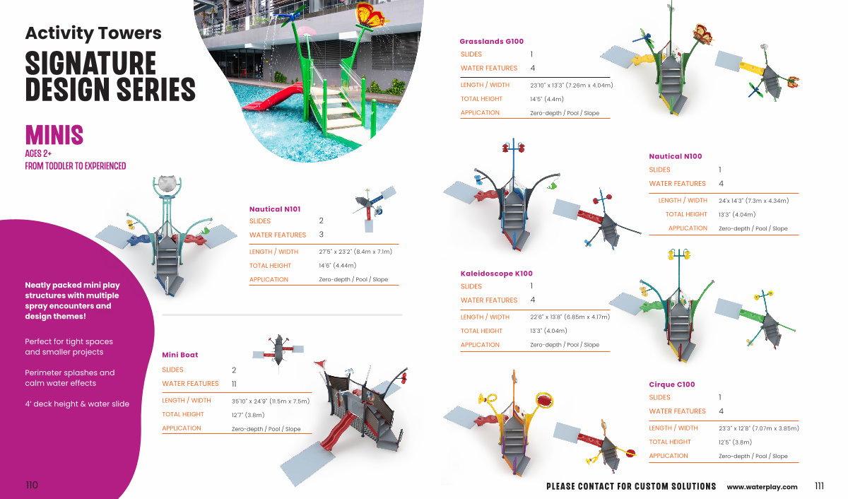 Neatly packed mini play structures with multiple spray encounters and design themes!