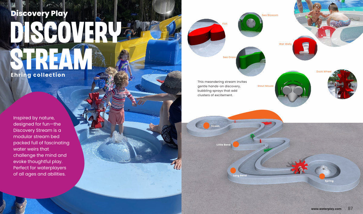 Inspired by nature, designed for fun— the Discovery Stream is a modular stream bed packed full of fascinating water weirs that challenge the mind and evoke thoughtful play. Perfect for waterplayers of all ages and abilities.