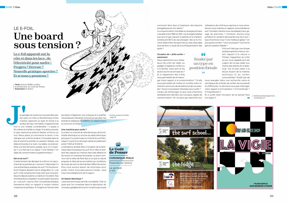 Si le surf n’ est pas une simple pratique sportive mais un certain rapport à la nature, à l’ Océan, l’ apparition du e-foil au pic nous rappelle qu’ il est urgent de ne pas céder aux chants des sirènes du marketing! De ne pas céder à la douce illusion de la maîtrise technique et du confort consumériste! Plutôt que de nous aveugler dans une recherche vaine et narcissique de contrôle, de confort, de nouveauté et d’ efficacité, ne devrions-nous pas interroger notre rapport à la frustration? À l’ incertitude? À l’ imperfection? Et si surfer était l’ occasion de se penser face à la vague?!