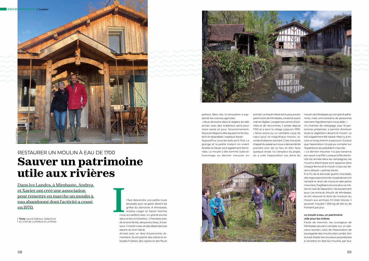 activité. Le Moulin Neuf est le plus ancien patrimoine de Mimbaste, construit avant même l’ église. Longtemps centre d’ activités et de rencontres, il existe depuis 1703 et a servi le village jusqu’ en 1970. « Nous avons eu un véritable coup de cœur pour ce magnifique moulin, raconte Andrea en souriant. C’ est une sorte d’ appel du passé qui nous a demandé de prendre soin de ce lieu et d’ en faire quelque chose. Vu l’ ampleur du projet, on a créé l’ association Les Amis du moulin de Mimbaste qui compte 8 adhérents, mais une trentaine de personnes viennent régulièrement nous aider. » Un chantier de nettoyage, avec 15 personnes présentes, a permis d’ enlever toute la végétation devant le moulin. Le toit a également été réparé. Mais il y a encore un long chemin à parcourir. Surtout que l’ association n’ a pas pu compter sur l’ expérience du précédent meunier. « Le dernier meunier n’ a pas transmis son savoir à sa fille. Lorsque la fée électricité est arrivée dans les campagnes, les moulins électriques sont apparus dans chaque ferme et le moulin à eau est devenu désuet », précise Xavier. À la fin de la seconde guerre mondiale, des regroupements de coopératives ont racheté le droit de mouture des petits meuniers, fragilisant encore plus ce métier en voie de disparition. Heureusement pour Les Amis du Moulin de Mimbaste, ils ont retrouvé le droit de mouture du moulin aux archives. S’ il était rénové, il pourrait moudre 1 000 kg de blé ou de froment par jour.