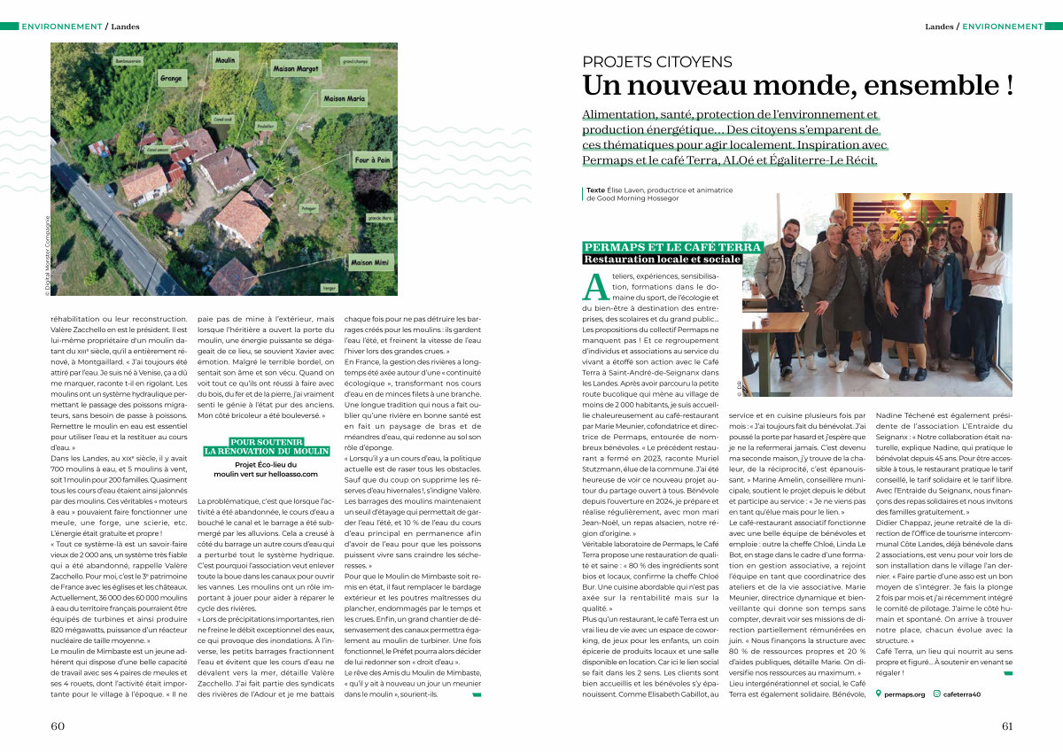 © Digital Monster Compagnie réhabilitation ou leur reconstruction. Valère Zacchello en est le président. Il est lui-même propriétaire d ' un moulin datant du xiii e siècle, qu ' il a entièrement rénové, à Montgaillard. « J’ ai toujours été attiré par l’ eau. Je suis né à Venise, ça a dû me marquer, raconte t-il en rigolant. Les moulins ont un système hydraulique permettant le passage des poissons migrateurs, sans besoin de passe à poissons. Remettre le moulin en eau est essentiel pour utiliser l’ eau et la restituer au cours d’ eau. » Dans les Landes, au xix e siècle, il y avait 700 moulins à eau, et 5 moulins à vent, soit 1 moulin pour 200 familles. Quasiment tous les cours d’ eau étaient ainsi jalonnés par des moulins. Ces véritables « moteurs à eau » pouvaient faire fonctionner une meule, une forge, une scierie, etc. L’ énergie était gratuite et propre! « Tout ce système-là est un savoir-faire vieux de 2 000 ans, un système très fiable qui a été abandonné, rappelle Valère Zacchello. Pour moi, c’ est le 3 e patrimoine de France avec les églises et les châteaux. Actuellement, 36 000 des 60 000 moulins à eau du territoire français pourraient être équipés de turbines et ainsi produire 820 mégawatts, puissance d’ un réacteur nucléaire de taille moyenne. » Le moulin de Mimbaste est un jeune adhérent qui dispose d’ une belle capacité de travail avec ses 4 paires de meules et ses 4 rouets, dont l’ activité était importante pour le village à l’ époque. « Il ne