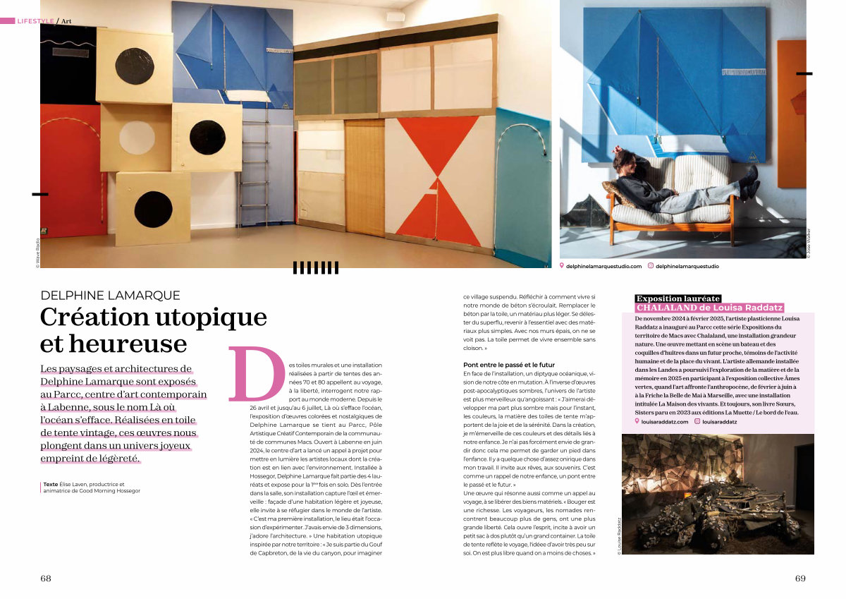 De novembre 2024 à février 2025, l’ artiste plasticienne Louisa Raddatz a inauguré au Parcc cette série Expositions du territoire de Macs avec Chalaland, une installation grandeur nature. Une œuvre mettant en scène un bateau et des coquilles d’ huîtres dans un futur proche, témoins de l’ activité humaine et de la place du vivant. L’ artiste allemande installée dans les Landes a poursuivi l’ exploration de la matière et de la mémoire en 2025 en participant à l’ exposition collective Âmes vertes, quand l’ art affronte l’ anthropocène, de février à juin à à la Friche la Belle de Mai à Marseille, avec une installation intitulée La Maison des vivants. Et toujours, son livre Sœurs, Sisters paru en 2023 aux éditions La Muette / Le bord de l’ eau. louisaraddatz. com louisaraddatz