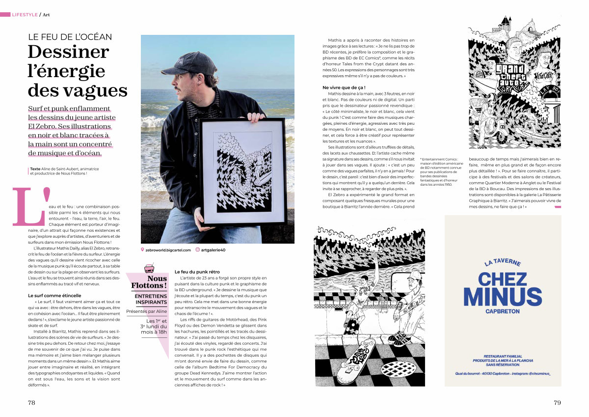 Ses illustrations sont d’ ailleurs truffées de détails, des lacets aux chaussettes. Et l’ artiste cache même sa signature dans ses dessins, comme s’ il nous invitait à jouer dans ses vagues. Il ajoute: « c’ est un peu comme des vagues parfaites, il n’ y en a jamais! Pour le dessin, c’ est pareil: c’ est bien d’ avoir des imperfections qui montrent qu’ il y a quelqu’ un derrière. Cela invite à se rapprocher, à regarder de plus près. ».
