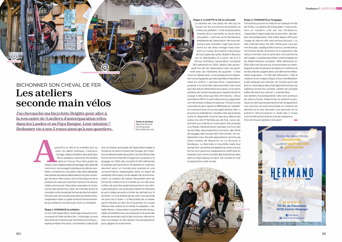 Étape 2, CLAVETTE & CIE la culturelle La clavette est une pièce de vélo qui se trouve sur les anciennes bicyclettes au niveau du pédalier. « C’ est la petite pièce chiante de la manivelle, la rotule de la bicyclette », s’ amuse Anne Bordenave, présidente de l’ association. Ne vous méprenez pas, Clavette n’ agit pas seulement sur les vélos vintage mais intervient au niveau de la partie mécanique de tous types de cycles. Basée à Boucau sur la Vélodyssée et à partir de juin à Tarnos Grândola, l’ association comptait 350 adhérents en 2024. Atelier vélo participatif, lieu de vie, l’ association crée une proximité avec ses habitants de quartier. « Chez nous on répare avec, nous pratiquons la réparation accompagnée par des salariés et des bénévoles en renfort », précise Anne. L’ association propose à la vente des vélos seconde main ainsi que des pièces détachées d’ occasion, la location solidaire de randonneuses pour expérimenter le voyage à vélo, ainsi que des animations. « Nous souhaitons offrir un autre discours en y apportant une dimension ludique et joyeuse! Choisir la voie culturelle et semi-sportive différente du“ vélotaf” en montrant tout ce qui est rigolo dans le vélo! », poursuit la présidente. Clavette crée ses propres outils et dispositifs comme des jeux détournés autour du vélo( 7 familles, jeu de l’ oie …) pour apprendre aux enfants en s’ amusant. Elle propose une flopée d’ événements hybrides comme des social rides, des projections-concerts, des récits de voyages, des courses 100 % féminines … en collaboration avec d’ autres associations comme Les Sales Gosses de Bayonne ou Le Bivouac à Bordeaux. La Biennale à bicyclette reste leur temps fort. Les belles échappées se vivent sous la forme d’ un parcours d’ expositions d’ affiches en extérieur qui met en lumière des illustrations vélo, dans le Pays basque et dans les Landes en mai et septembre cette année.