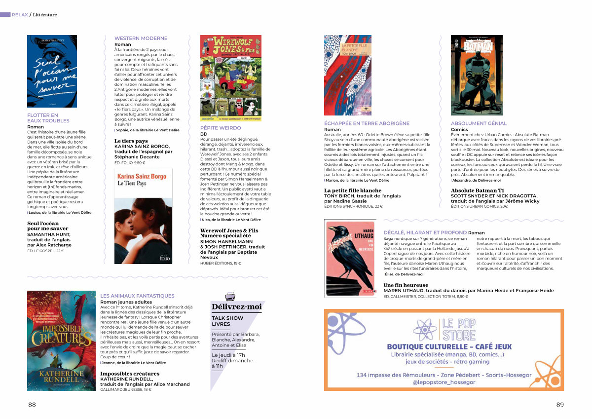 WESTERN MODERNE Roman À la frontière de 2 pays sudaméricains rongés par le chaos, convergent migrants, laisséspour-compte et trafiquants sans foi ni loi. Deux héroïnes vont s ' allier pour affronter cet univers de violence, de corruption et de domination masculine. Telles 2 Antigone modernes, elles vont lutter pour protéger et rendre respect et dignité aux morts dans ce cimetière illégal, appelé « le Tiers pays ». Un mélange de genres fulgurant. Karina Sainz Borgo, une autrice vénézuélienne à suivre!