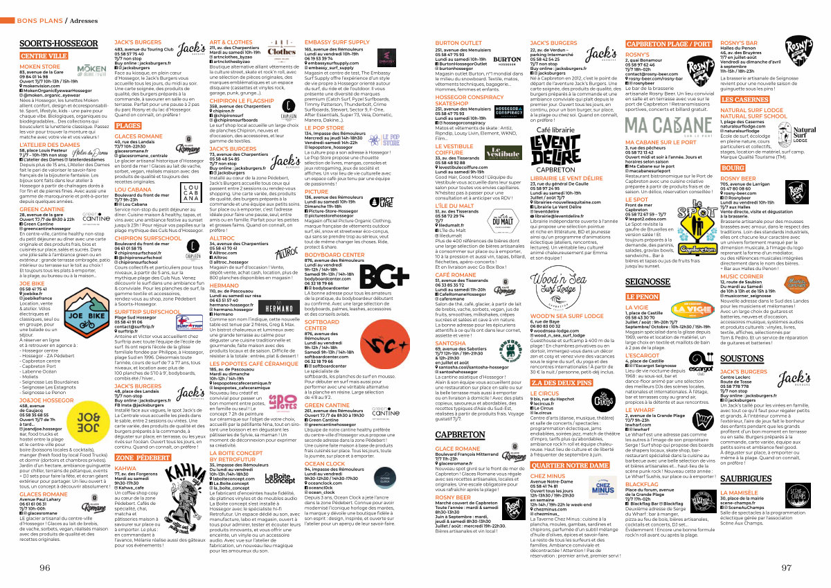 2, avenue de la Grande Plage 7J / 7 9h-23h lewharf. com lewharf Le Wharf est une adresse pas comme les autres à l’ image de son propriétaire Serge! Surf shop qui propose des boards de shapers locaux, skate shop, barrestaurant spécialisé dans la cuisine au barbecue avec une belle sélection de vins et bières artisanales et … haut-lieu de la scène punk rock! Nouveau cette année: Le Wharf Sushis, sur place ou à emporter!