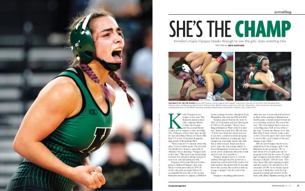 Kayla Vazquez is in a league of her own . The Kinnelon junior joined elite company March 4when she became just the second Morris County girl to capture astate wrestling title . Vazquez , athree-time state medalist , defeated Maya Hemo of Cherry Hill East 5-0 in the 132-pound championship match at Boardwalk Hall . “ This is unreal . I ’ ve dreamt about this since Iwas in fourth grade . The fact that I ’ m finally here doing it , especially in Atlantic City , isamazing ,” Vazquez said at the time .“ This moves my momentum forward . I ’ m already looking forward to next year , and defending my title .”