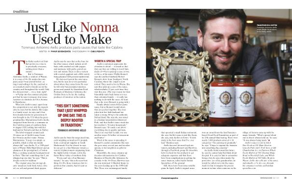 As Aiello looks toward his future , he says he cannot help but think about the past . Itiseasy for him to remember being aboy , hesays , when under the protective eye of his grandmother , he would be called on to stir the sauce . And it is fun to imagine the precise moment in time when someone inthe village of Serrata came up with the magic formula . “ What ’ sspecial about ours is that it always held on ,” hesays . “ It was always being made .” ■