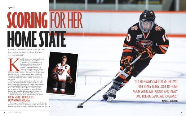 Acenter for the Premier Hockey Federation ’ s Metropolitan Riveters , who play their home games in Newark , Cornine prides herself on “ trying to do just as much on defense as on offense ,” she says . She doesn ’ t even wear the No . 9jersey . That went to her brother , Nick . Kendall wore No . 12 at Morristown Beard School , but that number had been retired by Rochester Institute of Technology , where she went to college , so she chose 10 , the closest .