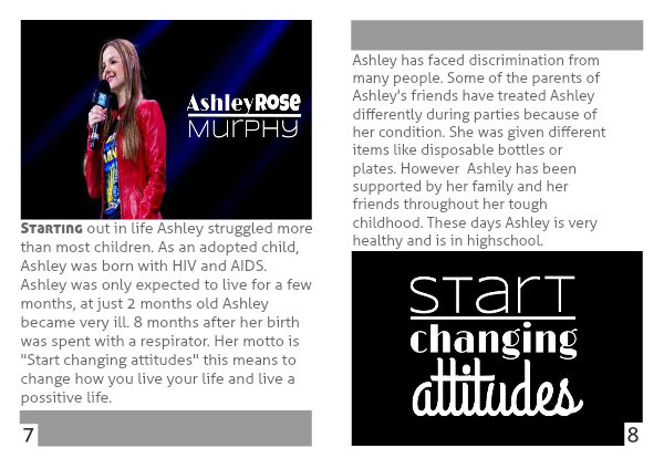 Ashley has faced discrimination from many people. Some of the parents of Ashley's friends have treated Ashley differently during parties because of her condition. She was given different items like disposable bottles or plates. However Ashley has been supported by her family and her friends throughout her tough childhood. These days Ashley is very healthy and is in highschool.