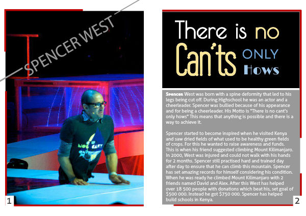 Spencer West was born with a spine deformity that led to his legs being cut off. During Highschool he was an actor and a cheerleader. Spencer was bullied because of his appearance and for being a cheerleader. His Motto is "There is no cant's only hows" This means that anything is possible and there is a way to achieve it.