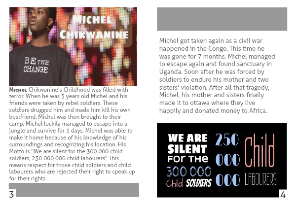 Michel Chikwanine's Childhood was filled with terror. When he was 5 years old Michel and his friends were taken by rebel soldiers. These soldiers drugged him and made him kill his own bestfriend. Michel was then brought to their camp. Michel luckily managed to escape into a jungle and survive for 3 days. Michel was able to make it home because of his knowledge of his surroundings and recognizing his location. His Motto is "We are silent for the 300 000 child soldiers, 250 000 000 child labourers" This means respect for those child soldiers and child labourers who are rejected their right to speak up for their rights.