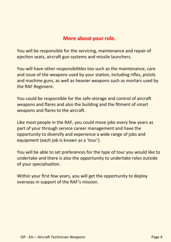 You could be responsible for the safe storage and control of aircraft weapons and flares and also the building and the fitment of smart weapons and flares to the aircraft.