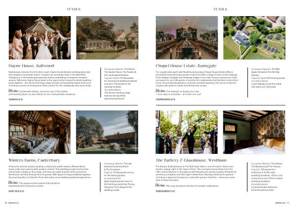 Ceremony Options: The Buttery, The Glasshouse & The Terrace Capacity: 150 guests for a barbecue or buffet-style wedding breakfast, 100 for civil ceremonies and 100 for seated wedding breakfast Accommodation: 9 ensuite double bedrooms & the Honeymoon Suite wedinkent. co. uk • 51