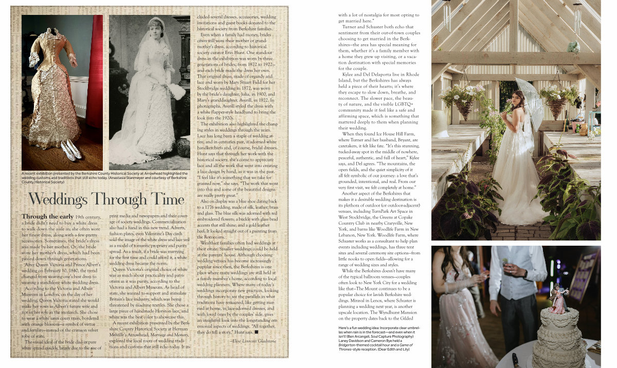 The exhibition also highlighted the changing styles in weddings through the years. Lace has long been a staple of wedding attire, and in centuries past, it adorned white handkerchiefs and, of course, bridal dresses. Hunt says that through her work with the historical society, she’ s come to appreciate lace and all the work that went into creating a lace design by hand, as it was in the past.“ I feel like it ' s something that we take for granted now,” she says.“ The work that went into this and some of the beautiful designs are really pretty great.” Also on display was a blue shoe dating back to a 1776 wedding, made of silk, leather, brass and glass. The blue silk was adorned with red embroidered flowers; a buckle with glass bead accents that still shine; and a gold leather heel. It looked straight out of a painting from the Rococo era. Wealthier families often had weddings at their estate. Smaller weddings could be held at the parents’ house. Although choosing wedding venues has become increasingly popular since then, the Berkshires is one place where many weddings are still held at a family member’ s home, according to local wedding planners. Where many of today’ s weddings incorporate new practices, looking through history to see the parallels in what traditions have remained, like getting married at home, in lace-adorned dresses, and with loved ones by the couples’ side, gives an insightful look into the longstanding ceremonial aspects of weddings.“ All together, they do tell a story,” Hunt says. n
