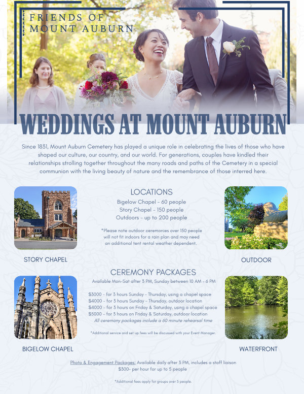 Since 1831, Mount Auburn Cemetery has played a unique role in celebrating the lives of those who have shaped our culture, our country, and our world. For generations, couples have kindled their relationships strolling together throughout the many roads and paths of the Cemetery in a special communion with the living beauty of nature and the remembrance of those interred here.