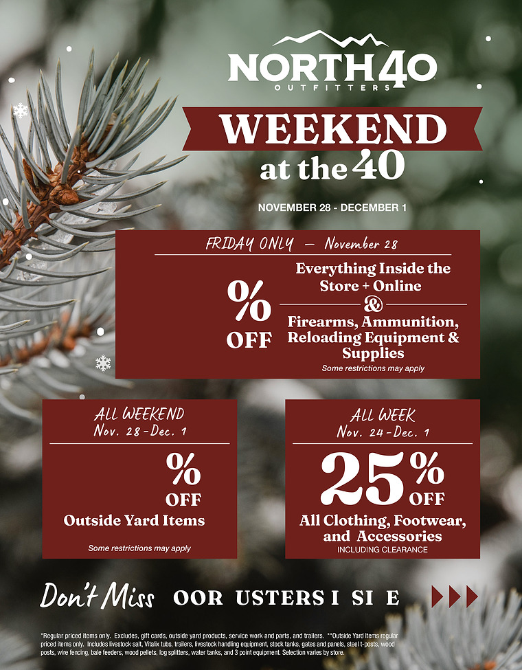 * Regular priced items only. Excludes, gift cards, outside yard products, service work and parts, and trailers. ** Outside Yard Items regular priced items only. Includes livestock salt, Vitalix tubs, trailers, livestock handling equipment, stock tanks, gates and panels, steel t-posts, wood posts, wire fencing, bale feeders, wood pellets, log splitters, water tanks, and 3 point equipment. Selection varies by store.